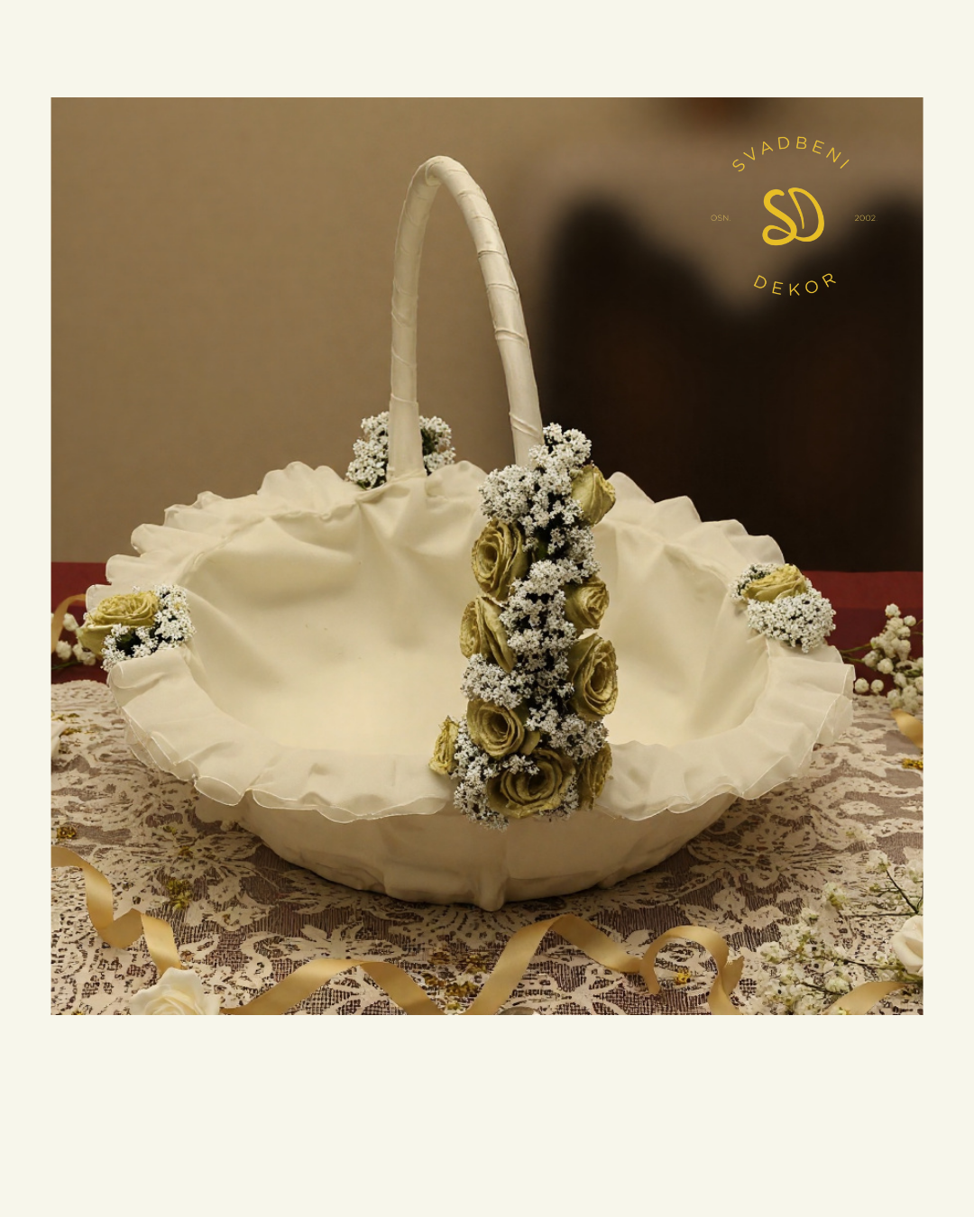 Dekorativna korpa za kicenje,dno oblozeno u satenu sa 18 velikih ruza